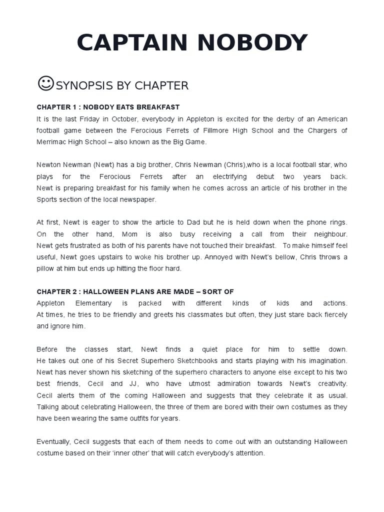 CHAPTER 21. CAPTAIN NOBODY SYNOPSIS BY CHAPTER CHAPTER 1. Chapter 1 - in which nobody eats breakfast chapter 2 - in which halloween plans are madesort of chapter 3 - in which i search for somebody im not.